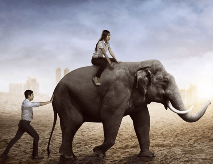 Haben Sie den Wunsch eine Veränderung aktiv anzugehen? Die Versuche eine Veränderung zu bewirken, scheitern oft daran, dass unser Unterbewusstsein keine Veränderungen mag. Unser Unterbewusstsein liebt Beständigkeit und Gewohnheiten. Will man also eine Veränderung in seinem Leben bewirken, muss man das Unterbewusstsein (auf dem Bild als Elefant dargestellt) davon überzeugen und motivieren in die gleiche Richtung zu gehen wie unser Bewusstsein (auf dem Bild die Reiterin) mit dem Veränderungswunsch.